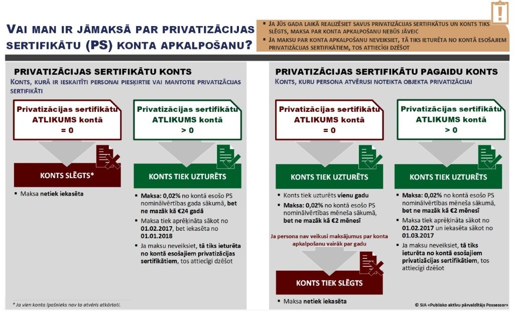 Kārtību, kādā tiek nodrošināta privatizācijas sertifikātu kontu apkalpošana, nosaka Ministru kabineta 2017.gada 3.janvāra noteikumi Nr.12 “Privatizācijas sertifikātu kontu apkalpošanas, privatizācijas sertifikātu izmantošanas un aprites administrēšanas noteikumi”. Šie noteikumi nosaka arī pakalpojumu maksas, kas tiks ieturētas no sertifikātu kontu īpašniekiem, sniedzot pakalpojumus saistībā ar kontu apkalpošanu.